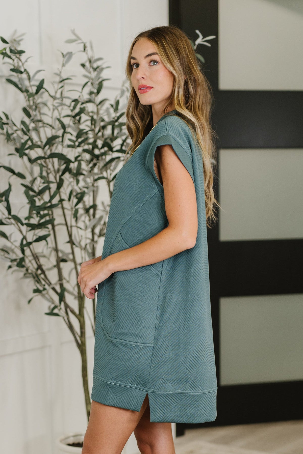 This Easy Hustle High Neck Dress in Ash Jade combines cozy jacquard texture with a playful stretch fit. Featuring a chic high neckline and a half front zipper with shiny gold hardware, it’s perfect for easy on-and-off style. Functional front patch pockets and banded sleeve cuffs add practical charm, while the banded hemline and side slits keep your look effortlessly cool and comfy all day long.