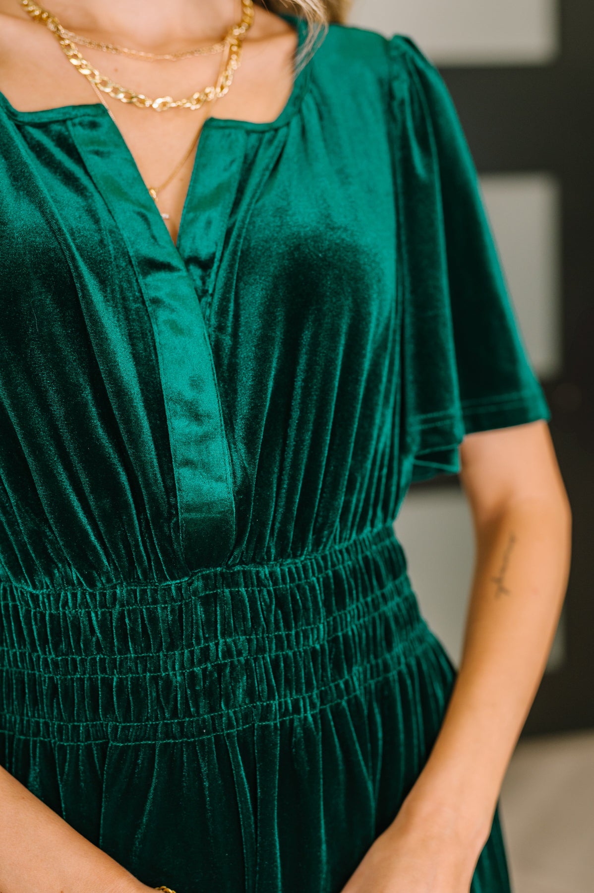 Meet the Softest Touch Velvet Tiered Dress—your new favorite for comfort that doesn't compromise on style. This luxe piece features sumptuous velvet knit with high stretch for all-day ease, a chic split neckline, and dreamy gathered shoulder puff sleeves that steal the show. The smocked elastic waist defines your silhouette while the tiered, gathered skirt creates beautiful movement and dimension. Practical side pockets keep your essentials close, making this dress as functional as it is fabulous. Dress it up or down for endless possibilities.