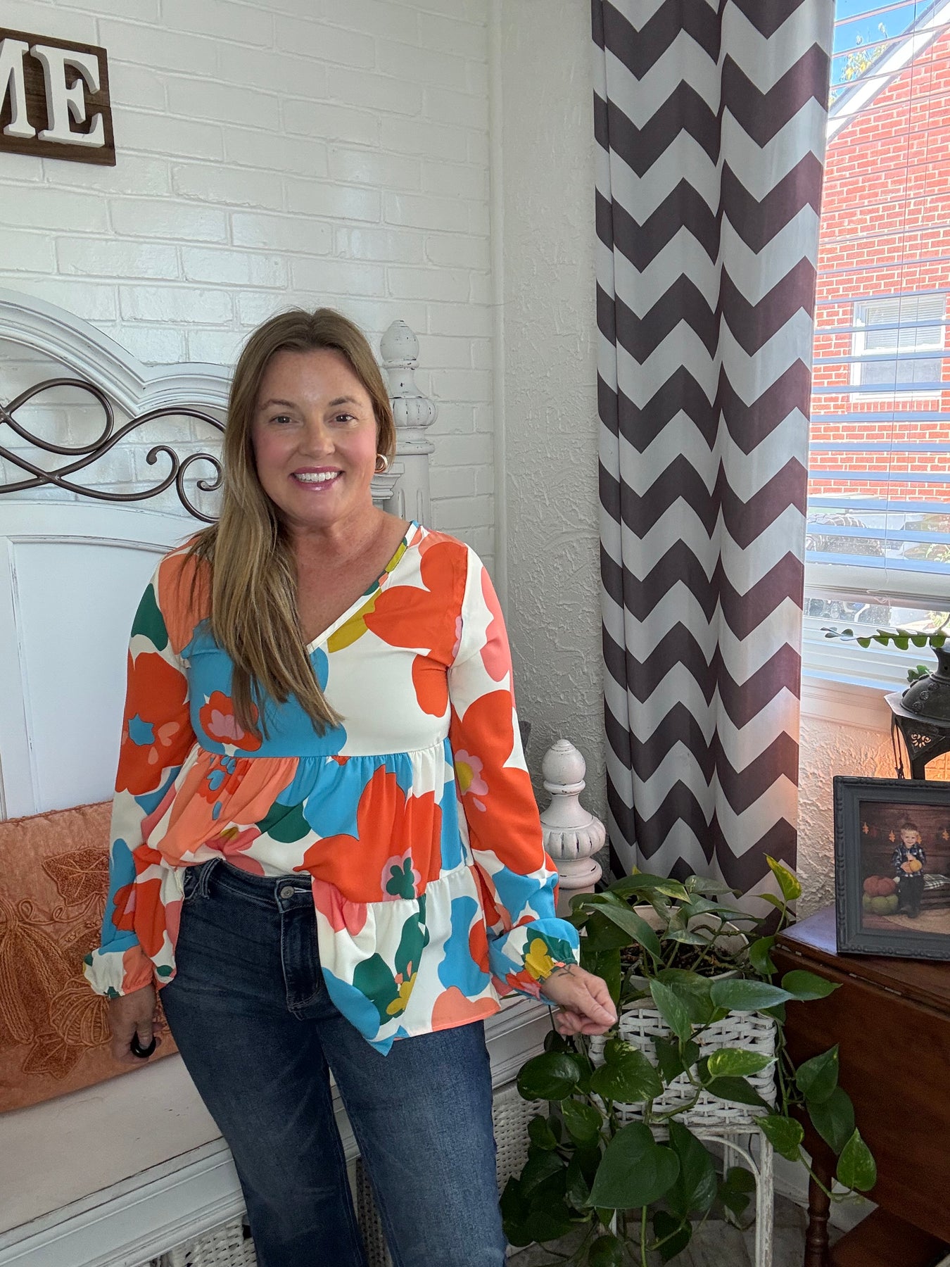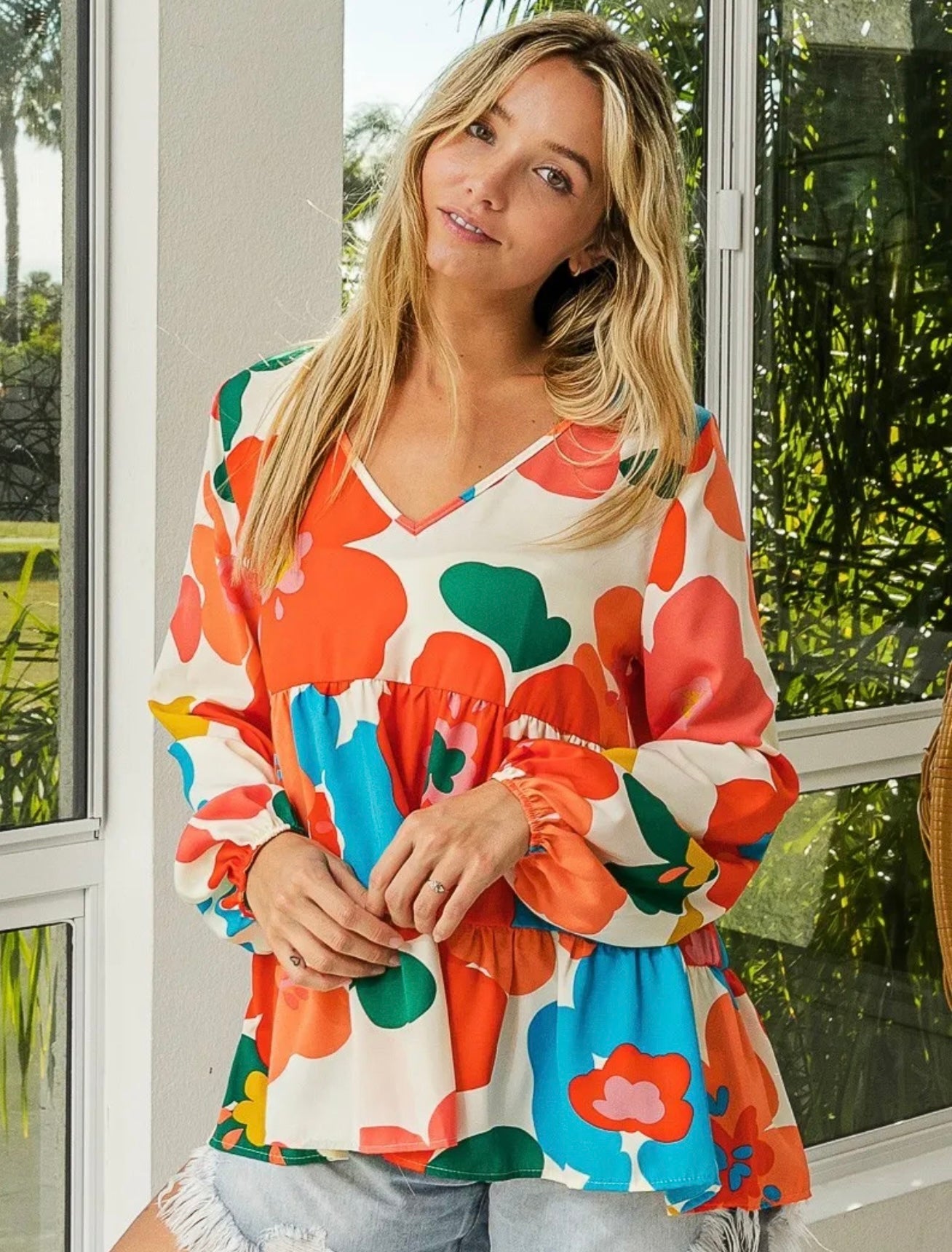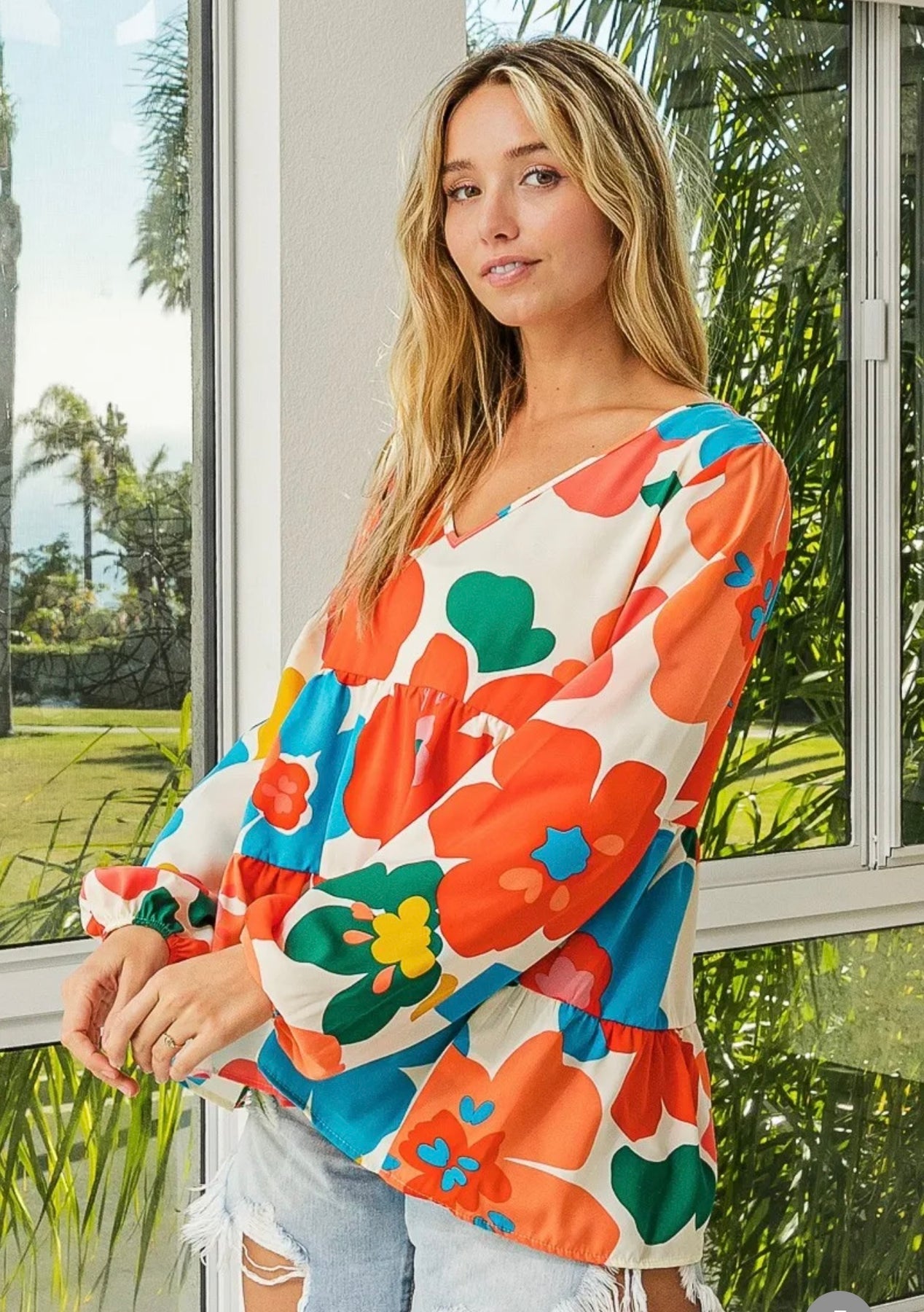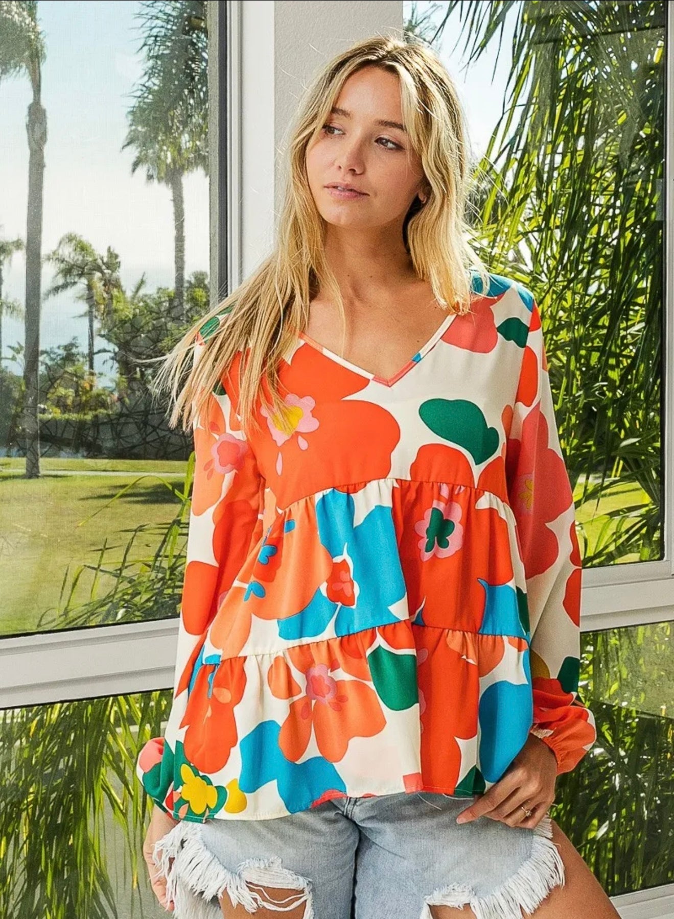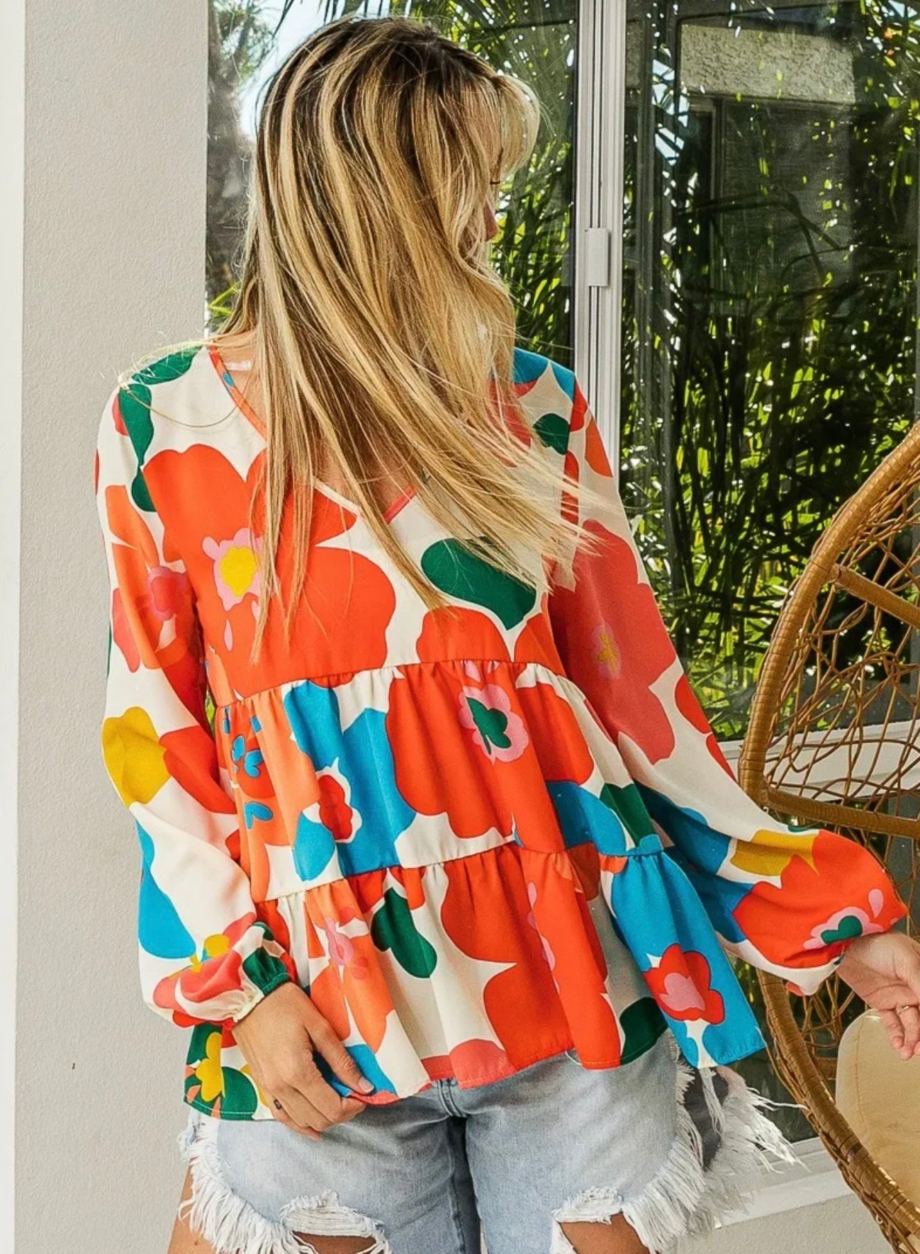 This stunning floral print blouse features a captivating multicolor design with vibrant orange, blue, and green tones. Crafted from lightweight, breathable fabric, it offers superior comfort and style. The flattering V-neckline and tiered ruffle construction create an elegant silhouette, while the relaxed fit ensures all-day comfort. The long sleeves with elastic cuffs provide versatility for different seasons. Perfect for pairing with jeans, shorts, or skirts, this blouse transitions effortlessly from casual daywear to evening outings. The eye-catching floral pattern makes it a statement piece that adds instant charm to any wardrobe.