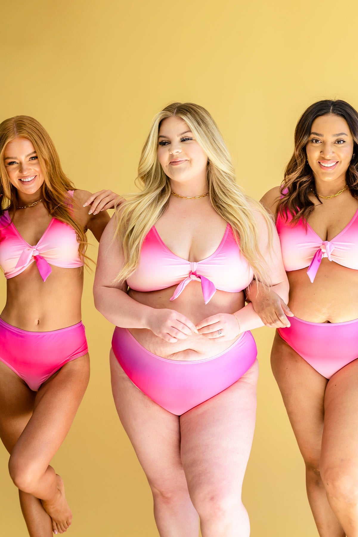 Slip into our vibrant Jamaica Ombre Two Piece Swimsuit and you'll instantly feel a sunny vibes coming your way! This eye-catching set features a dreamy ombre design, removable cups, and a decorative tie that gives it a touch of beachy chic. The v-neck bikini top, mid-rise fit and cheeky bottom are fully lined for a comfy and confident fit like no other. Get ready to make waves!