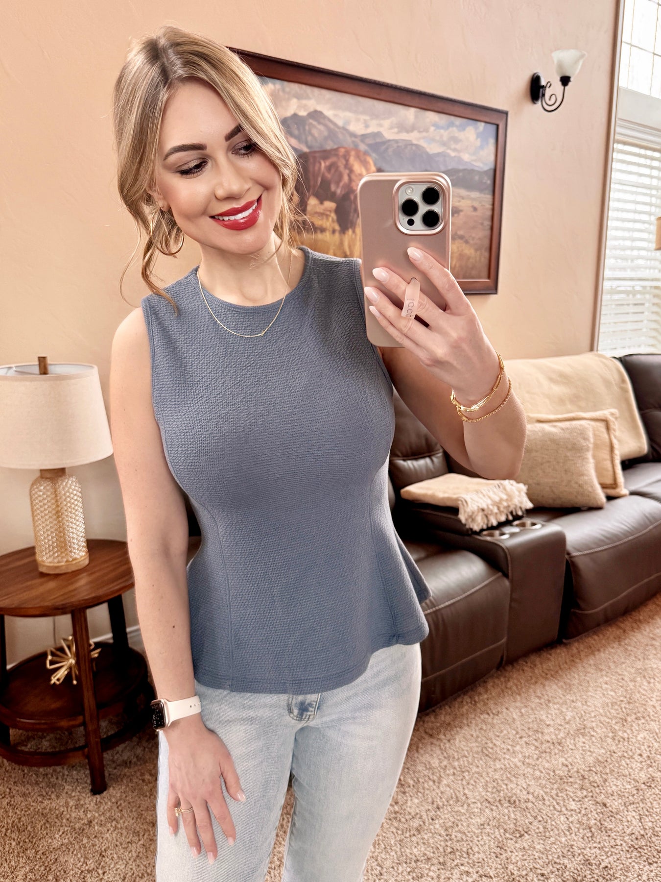 Sleeveless Peplum Knit Top In Denim